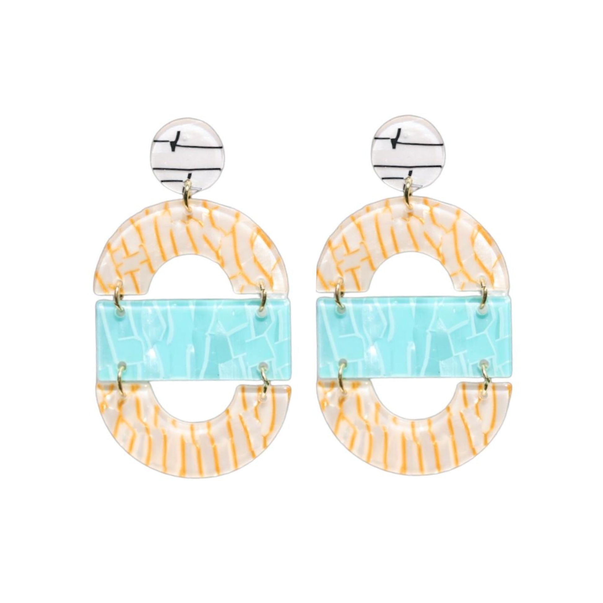 Aesthetic look at its finest! Meet Aviva. These acrylic earrings combine orange and aquatic turquoise tones and textures in unique geometric shapes, and creates a look that's soft, bright, and beautiful. The ideal accessory to complement your artistic and unique style!